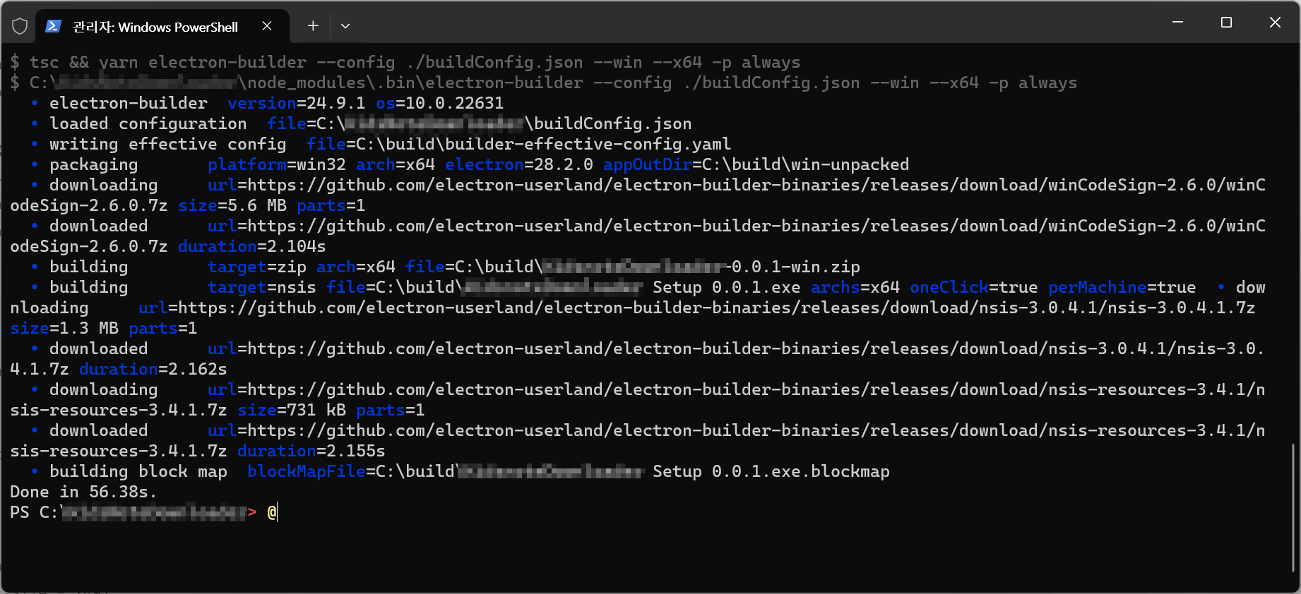 관리자 권한으로 VS Code 혹은 터미널을 열어주어 다시 시도하면 빌드 후 패키징처리가 잘 되는걸 확인할 수 있다.