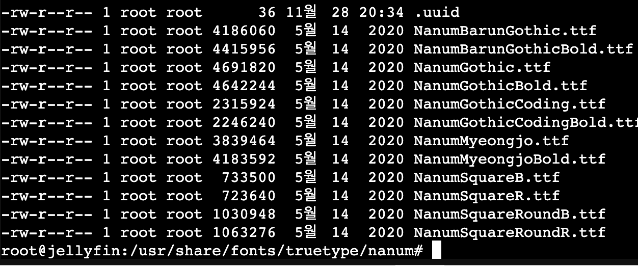 /usr/share/fonts/truetype 를 볼륨컨테이너로 따로 뺀 뒤, 빠진 폴더에 nanum 이라는 폴더를 만들고 그 안에 아래 그림과 같이 폰트를 넣어주자.