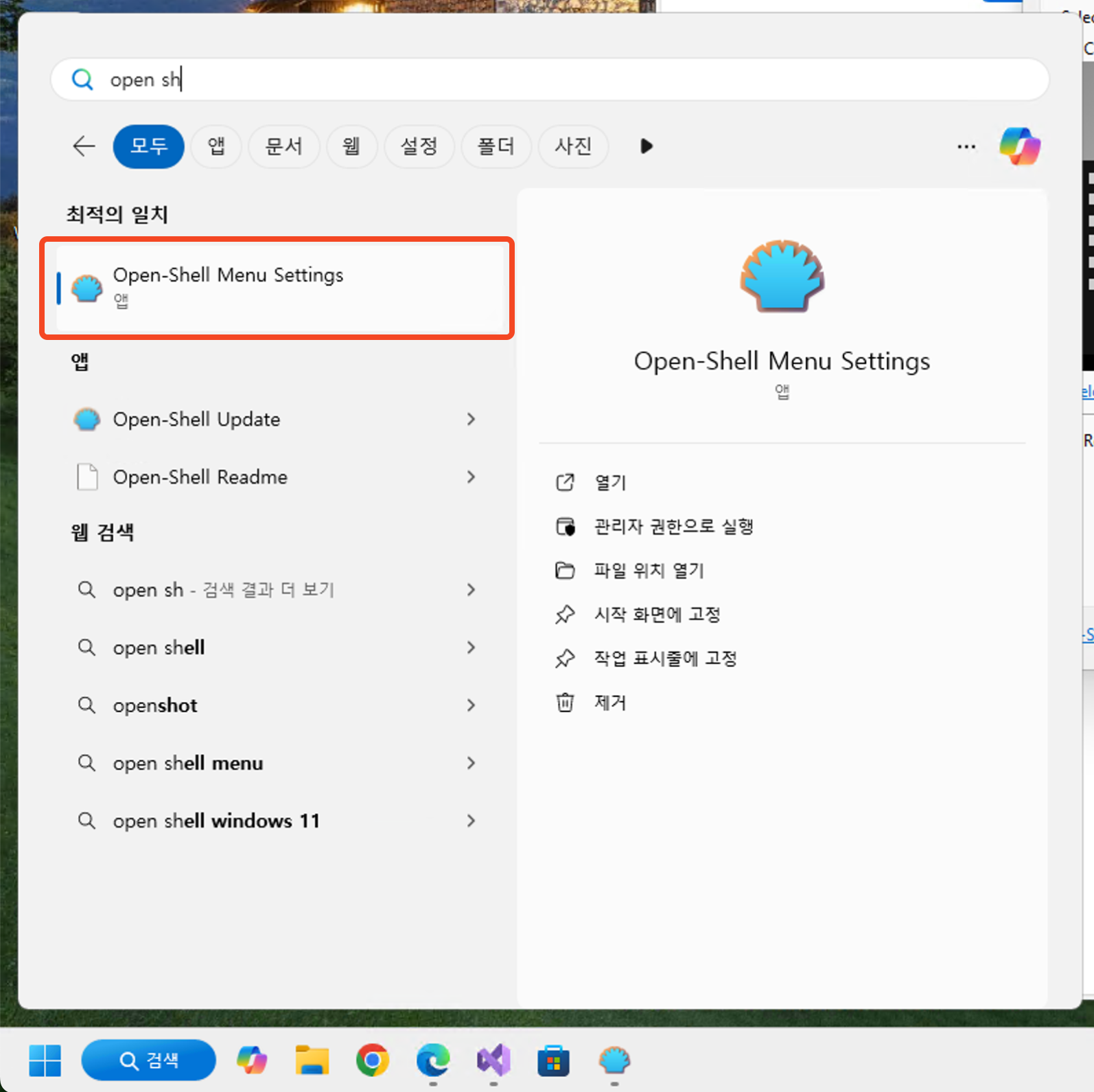 설치 후 시작에서 open shell 로 검색하여 표시되는 Open-Shell Menu Settings 앱을 실행합니다.