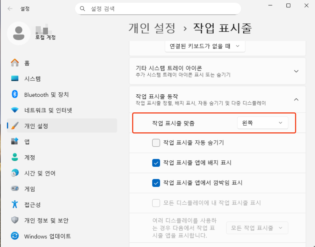 아래 사진과 같이 왼쪽으로 작업표시줄이 정렬된 것을 확인할 수 있습니다.